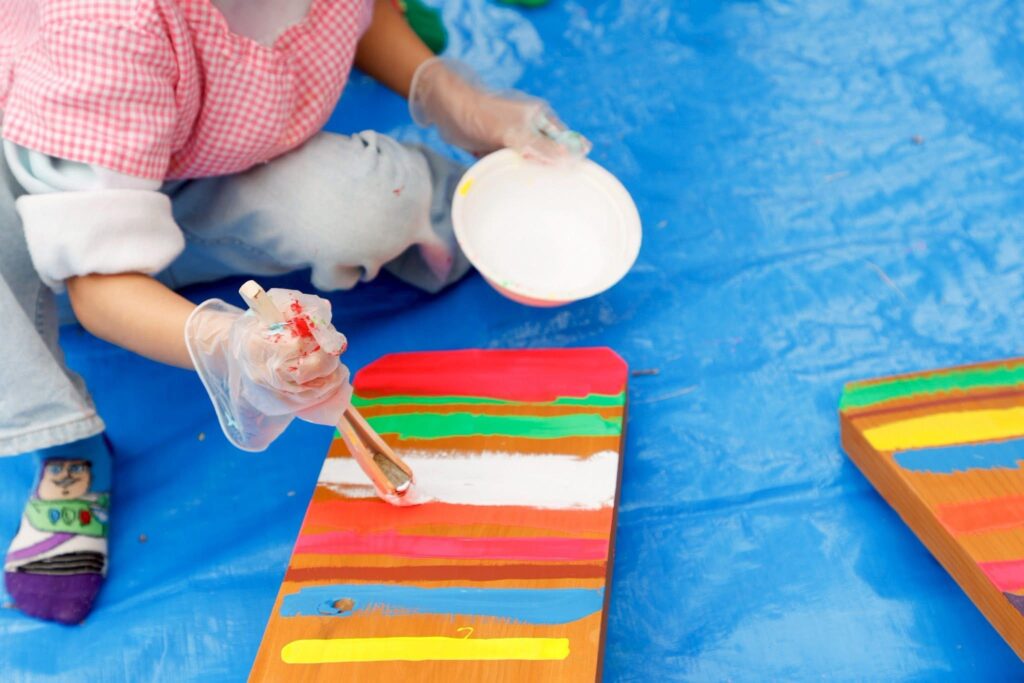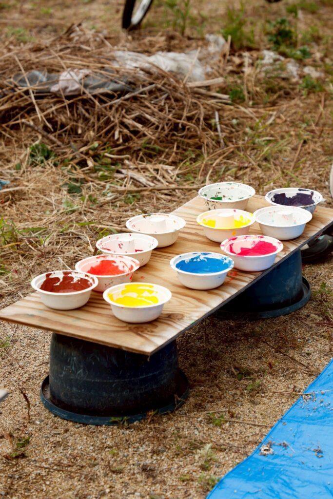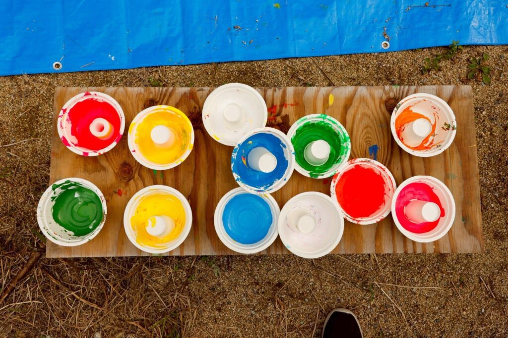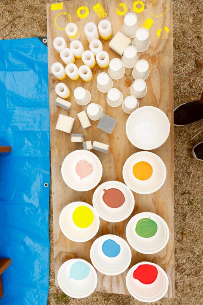 絵の具、スポンジ、紙コップ、スポンジ